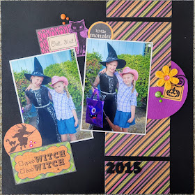 Scrap with Stacy Tic Tac Toe Challenge. For the Tic Tac Toe, I went straight down the middle. The 2015 are foam stickers, there are circles all over the place, and on the right purple stickers is a swirl paper clip holding the little pumpkin tag. So happy to have completed another page and I love how it turned out.